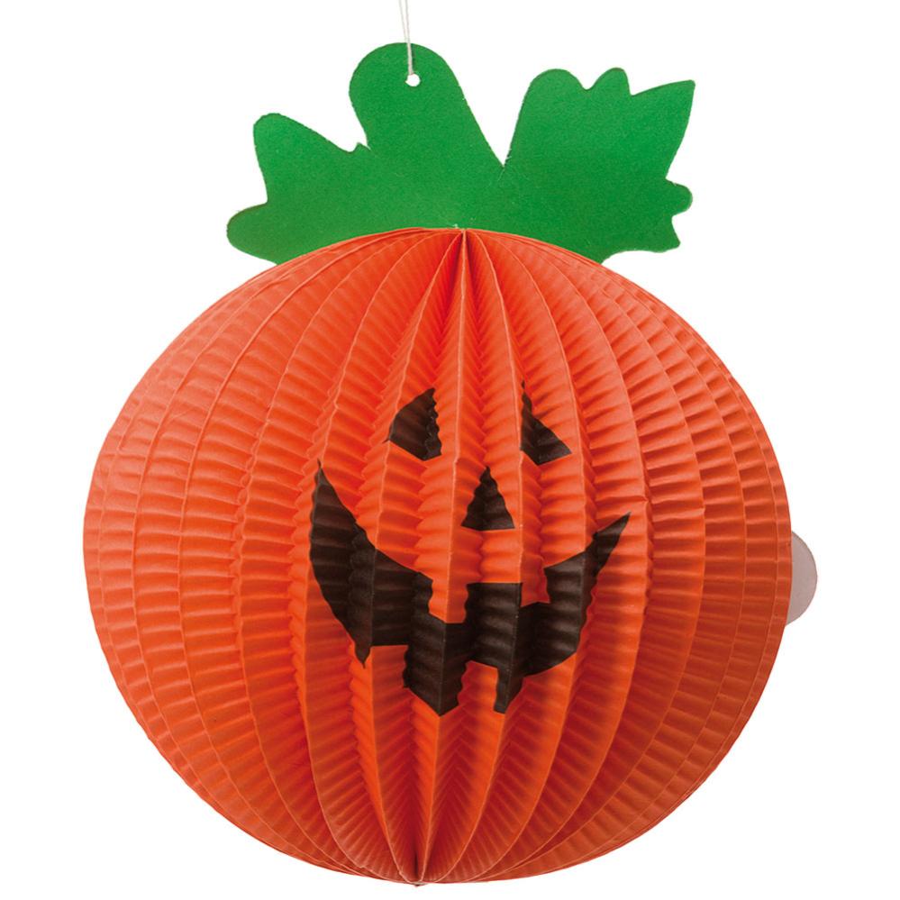 Hängande Dekoration Pumpa består av en orange honeycomb med svart Halloween pumpa ansikte, samt grön detalj högst upp. Vik enkelt ut pumpan och häng upp den i ditt hem eller på festen. Häng upp pumpan med hjälp av det vita snöret som sitter fast på toppen. Pumpan är tillverkad i papp.