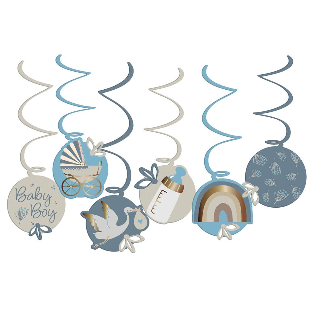 Hängande Dekorationer Baby Boy 6-pack består av sex dekorativa virvlar, där varje virvel avslutas med en rund pappdekoration. Motiven inkluderar texten "Baby Boy", en barnvagn, en stork, en nappflaska, en regnbåge och blomknoppar.