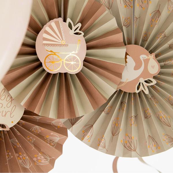 Hängande Dekorationer Solfjäder Baby Girl 3-pack består av tre hängande dekorationer i form av solfjädrar: en liten randig i beige och rosabrun samt två stora i rosabrun eller beige med blomknoppar. Dessutom ingår tre pappersdekorationer som fästs i mitten av solfjädrarna: en rosabrun med en vit stork, en gammelrosa med en barnvagn och en beige med texten "Baby Girl". Ett vitt snöre medföljer för enkel upphängning.