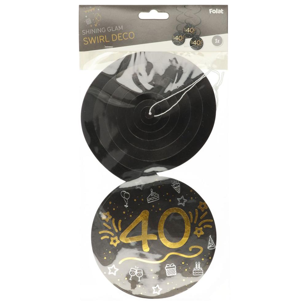 Hängande Dekorationer Svart 40 år 3-pack omfattar hängande födelsedagsdekorationer i form av tre virvlar med rundformad hårdpapp, dekorerade med siffran 40, stjärnor, tårtor, partyhattar, prickar och dricksglas i silver och guld mot en svart bakgrund.