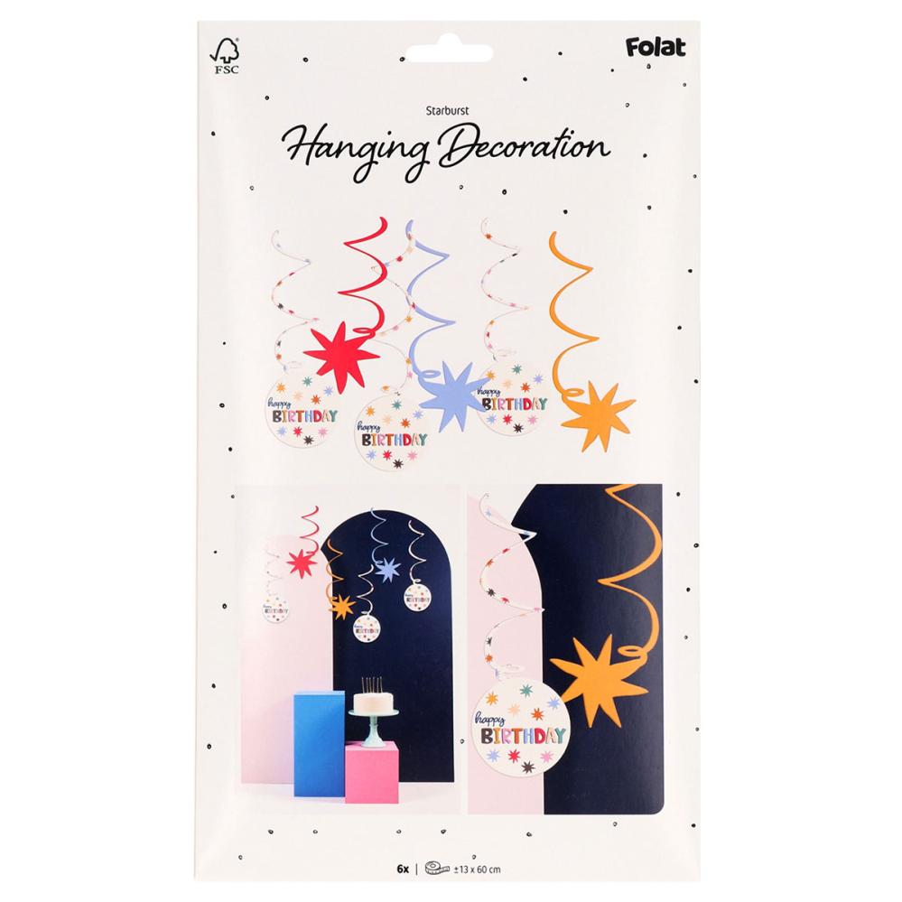 Hängande Födelsedagsdekorationer med Stjärnor 6-pack omfattar hängande födelsedagsdekorationer i form av sex virvlar, varav tre har stjärnor och tre har runda hårdpappdekorationer med texten "Happy Birthday" och stjärnor i svart, blått, grönt, orange, rött, brunt och rosa mot en vit bakgrund.