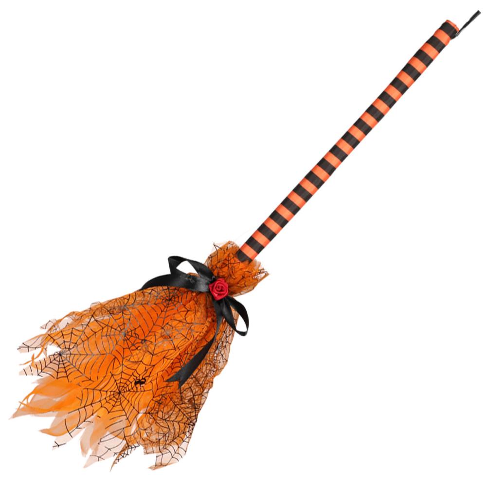Hängande Häxkvast omfattar en hängande halloweendekoration i form av en orange och svart häxkvast, utrustad med en ögla för enkel upphängning. Kvasten har ett randigt skaft, orange nättyg med svart spindelmotiv samt ett svart band med röd ros. OBS! Produkten är endast avsedd som dekoration och bör inte användas som en leksak.