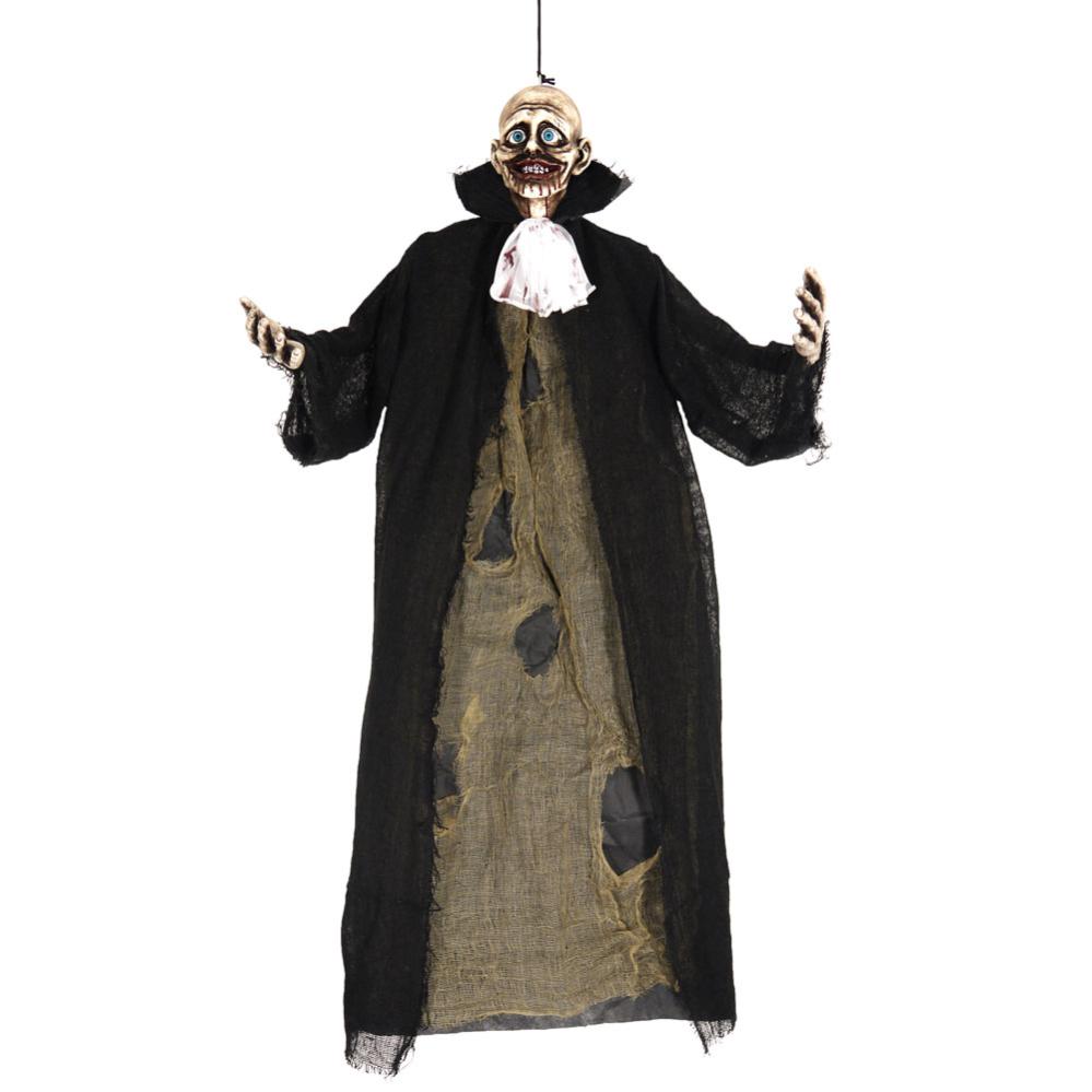Hängande Spöke Dekoration består av en hängande Halloween dekoration som föreställer ett blodigt spöke med svart och grön klädsel. Spökets armar är böjbara så du kan justera dem precis som du vill, den har också en liten ögla mitt på huvudet som du kan hänga upp den i.