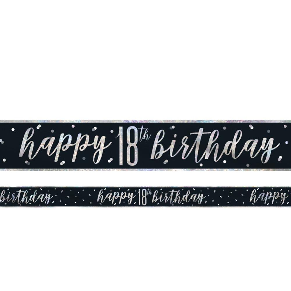Happy 18th Birthday Banderoll består av en svart banderoll med detaljer och texten "Happy 18th Birthday" i holografiskt silver.