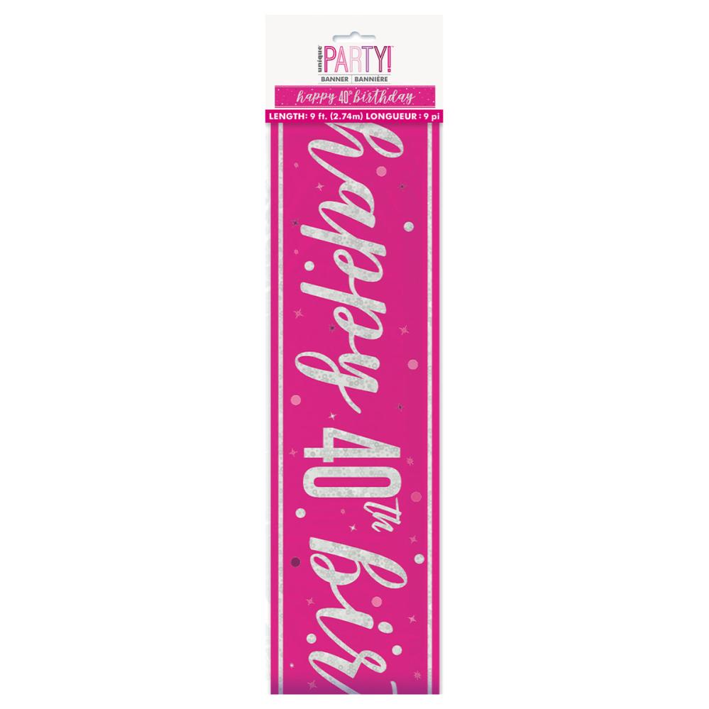 Happy 40th Birthday Girlang Cerise 2,74 m är en cerisefärgad girlang med texten "Happy 40th Birthday" i holografiskt silver.