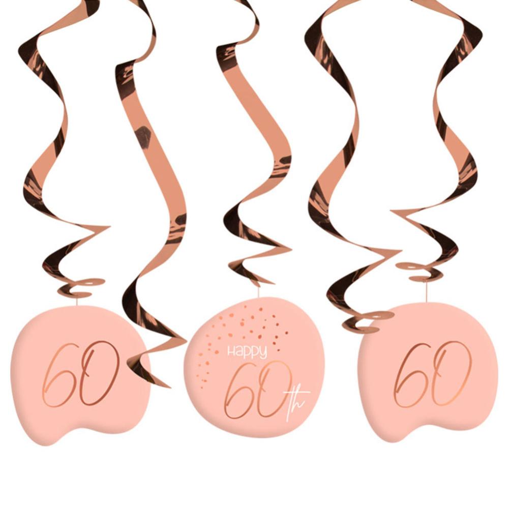 Happy 60th Hängande Dekorationer Ljusrosa innehåller 5 stycken roseguldiga swirls, varav tre av dem har ljusrosa hängande dekorationer med "Happy 60th" text i vitt och roseguld. Dekorationerna har även praktiska upphängningsöglor i plast.