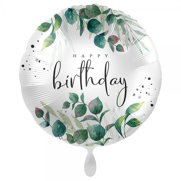 Happy Birthday Ballong Magic Wishes omfattar en vit, rund folieballong med texten "Happy Birthday" samt dekorativa bladmotiv i olika nyanser av grönt. Ballongen fylls med luft eller helium och blir ca 43 cm stor.