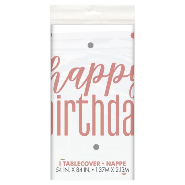 Happy Birthday Bordsduk Vit omfattar en vit plastduk med rosa "Happy birthday" text och prickar i grönt, grått och rosa. Duken är ca 1,37 x 2,13 meter och är tillverkad i tunn plast.