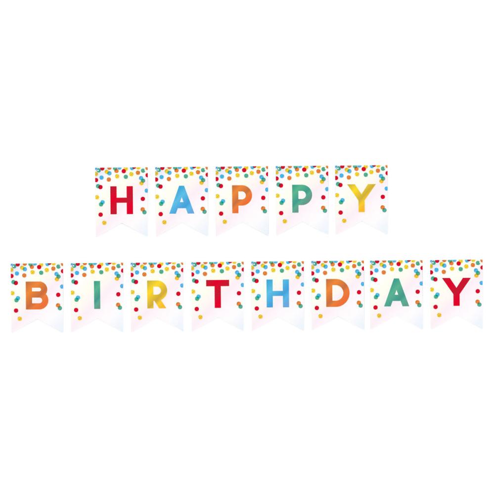 Happy Birthday Flaggirlang med Prickar omfattar en födelsedagsgirlang med tretton flaggor som hänger på ett vitt band och bildar texten "Happy Birthday" på en vit bakgrund med färgglada prickar.