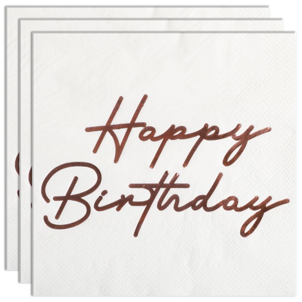 Happy Birthday Servetter Roséguld 16-pack består av sexton vita engångsservetter i tre lager som har texten "Happy Birthday" tryckt i glänsande roséguld på en sida, medan övriga sidor är helt vita.