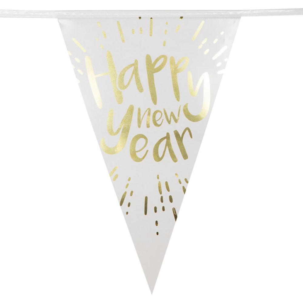 Happy New Year Girlang Vit omfattar en ca 4 meter lång girlang med vita flaggor med guldiga "Happy New Year" texter. Flaggorna är ca 30 x 20 cm stora.