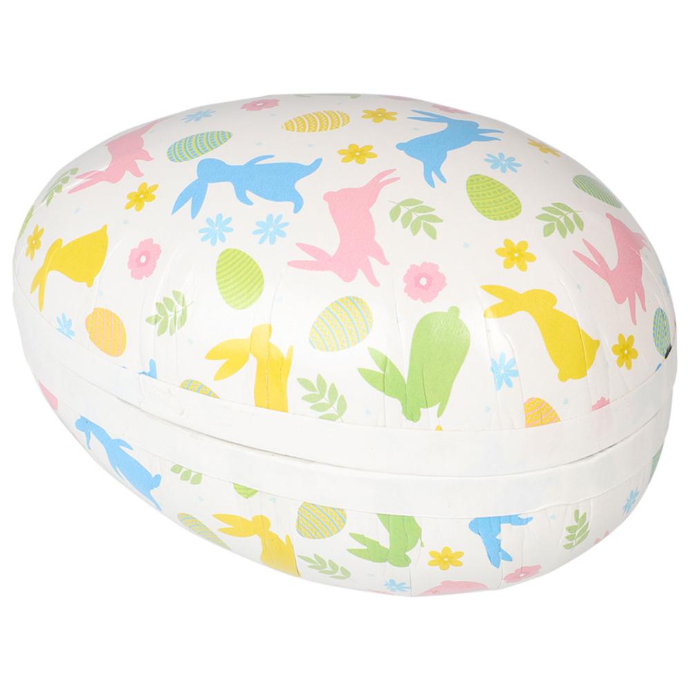 Harar Påskägg 8x12 cm är ett vitt påskägg, dekorerat med blommor, växtblad, påskägg och harar i rosa, blått, gult och grönt.
