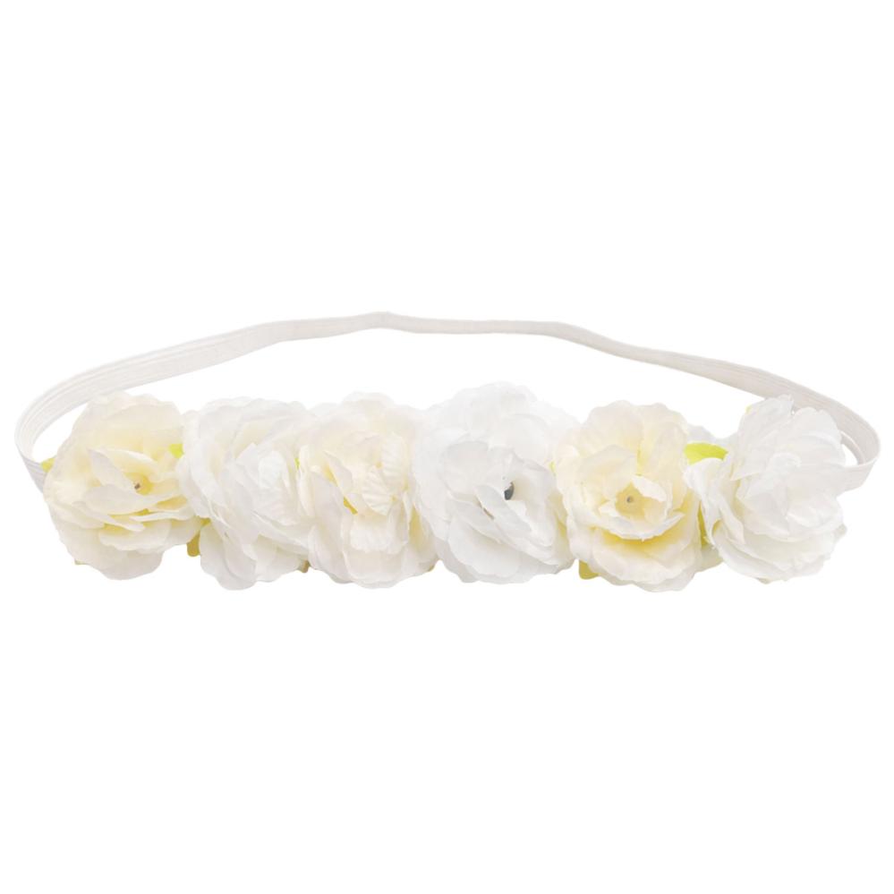 Hårband med Vita Blommor omfattar ett vitt elastiskt hårband dekorerat med sex vita blommor och gröna blad, varav tre av blommorna har diskreta gula detaljer.
