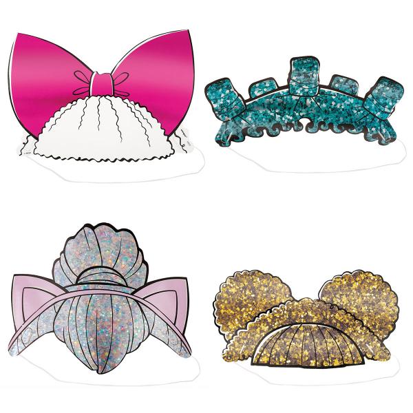 Hårdiadem LOL Surprise 4-Pack består av fyra diadem av papper formade som håret och accessoarerna från dockorna Queen Bee, Cosmic Queen, Diva och Kitty Queen från LOL Surprise.