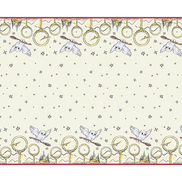 Harry Potter Pappersduk omfattar en ljusgul bordsduk i papper med motiv från Harry Potters värld. Motiven är i form av ugglan Hedwig, Hogwarts byggnaden och Quidditch planen samt små stjärnor. Duken är ca 1,37 x 2,13 meter.