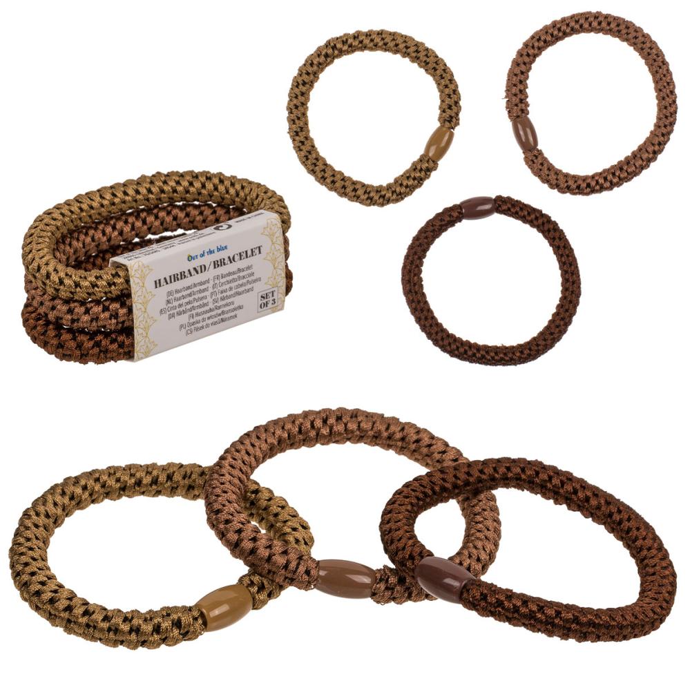 Hårsnoddar Brun Färgmix 3-pack består av slitstarka hårsnoddar i tre bruna nyanser med ett vävt mönster och en dekorativ mittdetalj. De kan även användas som stilrena armband.