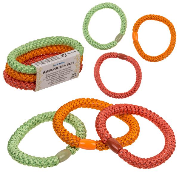 Hårsnoddar Färgmix 3-pack består av tre slitstarka hårsnoddar i färgerna röd, orange och grön med ett vävt mönster och en dekorativ mittdetalj. De kan även användas som stilrena armband.