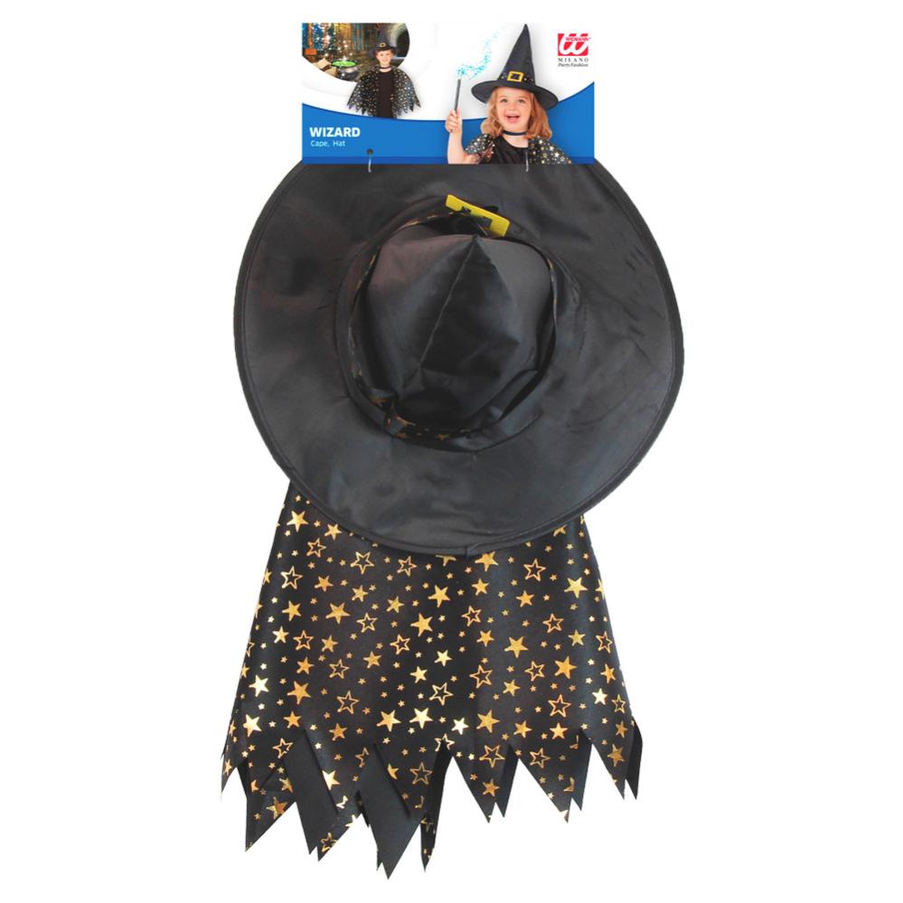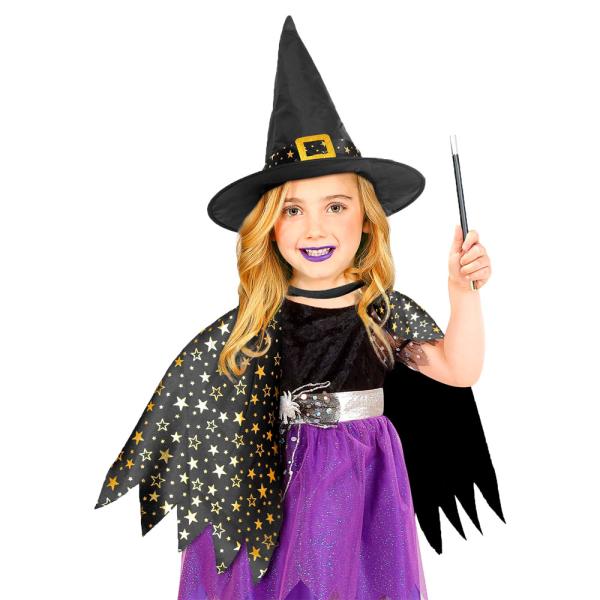Häxa Tillbehörskit Barn omfattar ett tillbehörskit med en häxhatt och en kort mantel med stjärnmotiv. Tillbehören är i polyester och passar barn.