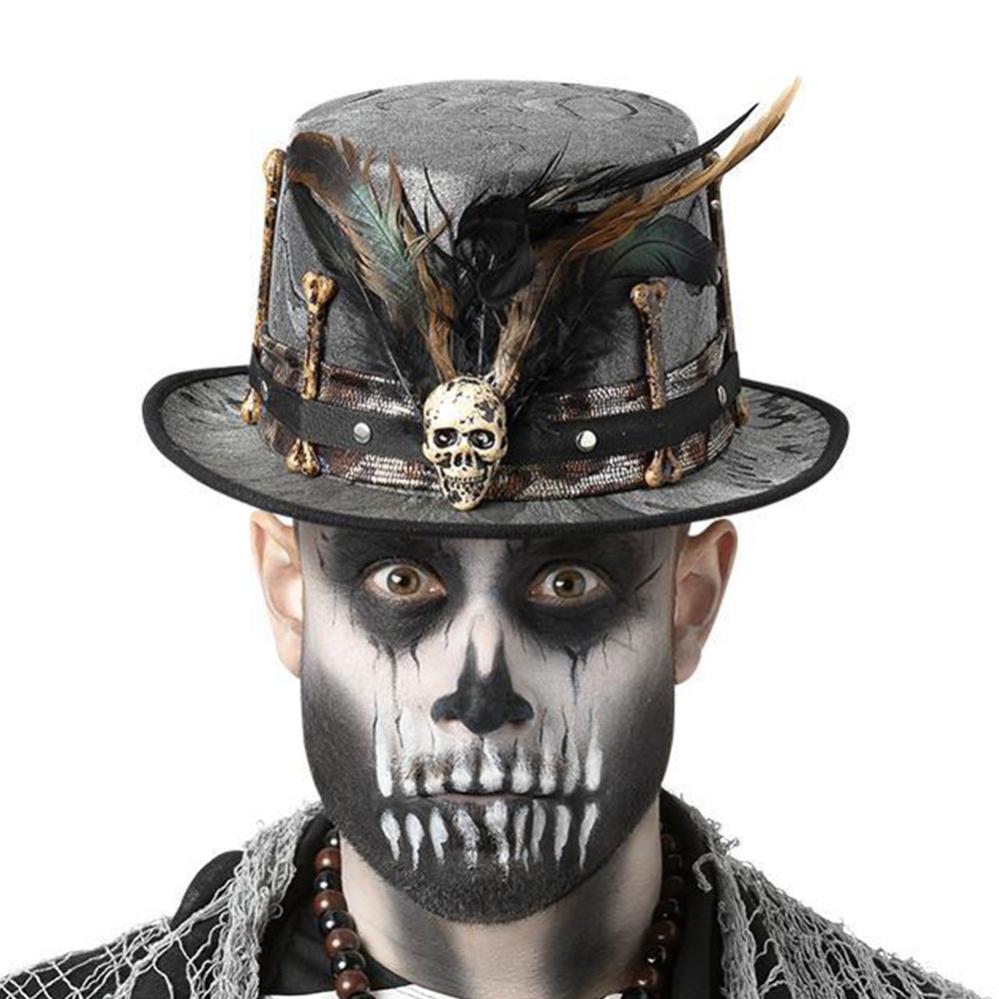 - Hög hatt med med dödskalle, ben och fjädrar.