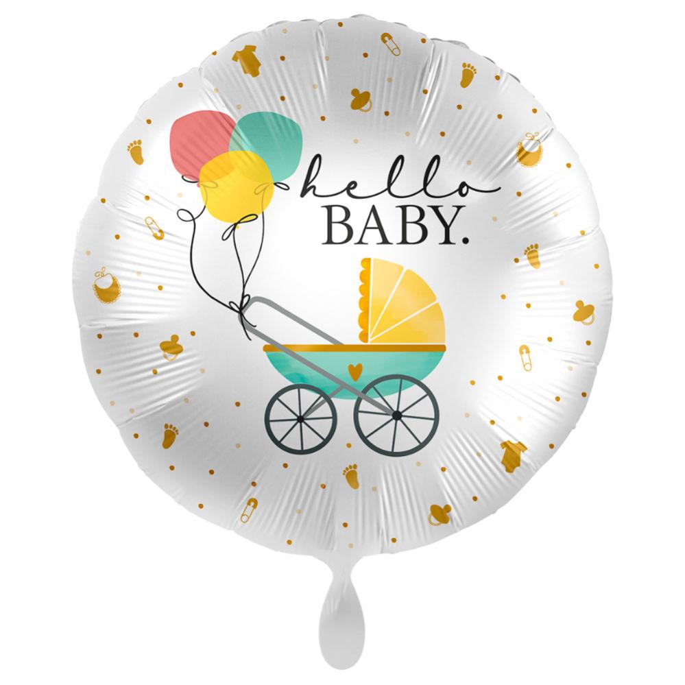 Hello Baby Ballong Baby Buggy omfattar en vit, rund folieballong med guldiga små bebismotiv, texten "Hello Baby" och ett fint motiv av en barnvagn med ballonger. Ballongens fylls med luft eller helium och blir ca 43 cm stor.