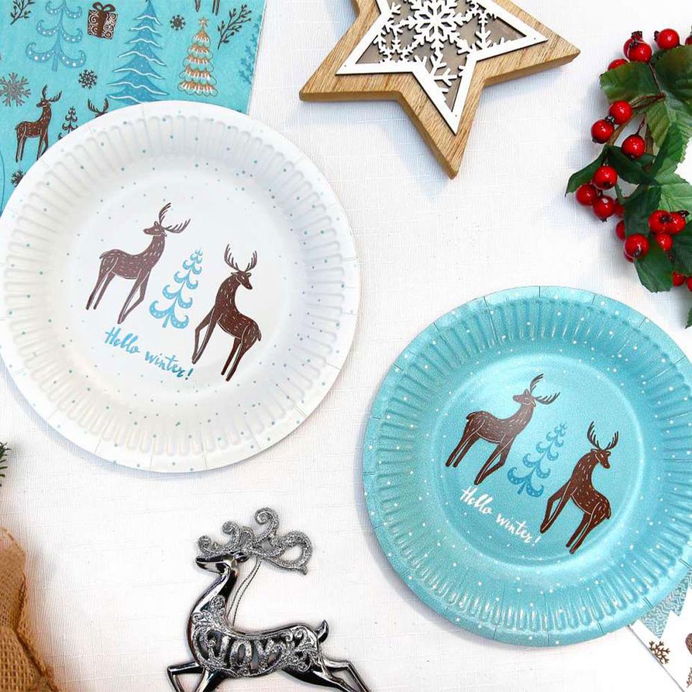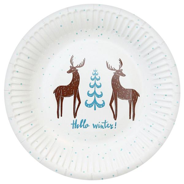 Hello Winter Pappersassietter 6-pack innehåller sex vita pappersassietter, dekorerade med två bruna renar, en blå gran, blå prickar och texten "Hello Winter" i blått.