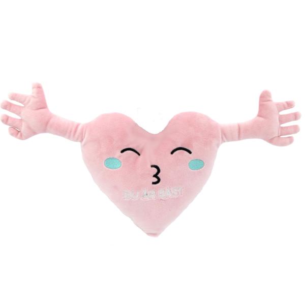 Hjärtkudde med Armar Du Är Bäst 40 cm är en hjärtformad ljusrosa kudde med utsträckta armar. Kudden har ett broderat motiv av ögon och mun i svart, turkosa kinder samt texten "DU ÄR BÄST" i vitt.