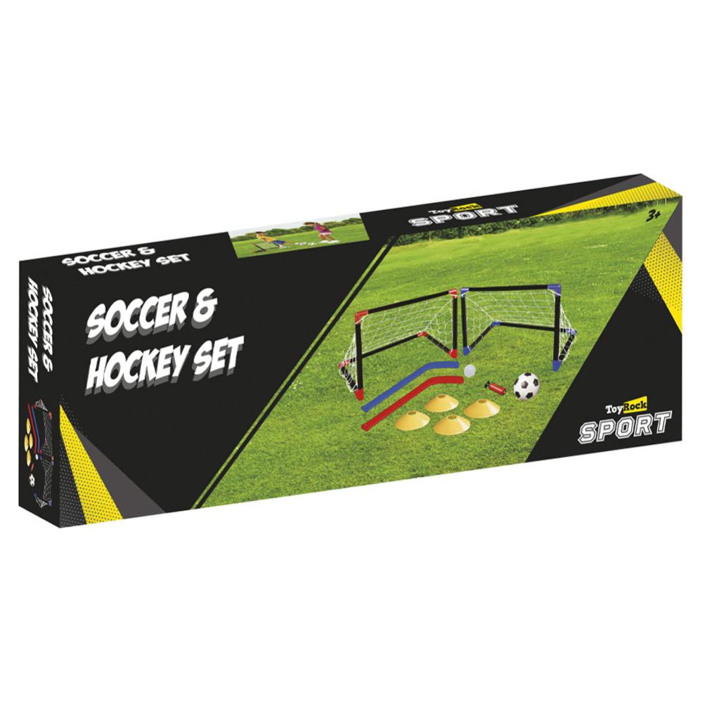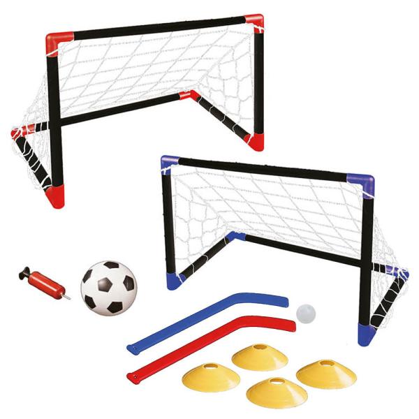 Var alltid redo för en spännande fotbolls- eller hockeymatch med detta roliga fotbolls- och hockeyset! Ett riktigt roligt hockey- och fotbollsset med mål, koner, klubbor, bollar och bollpump, vilket är allt du behöver för att skapa din egen liten plan att spela på. Utmärkt set för dig som vill spela tillsammans med en kompis eller för dig som bara vill träna.