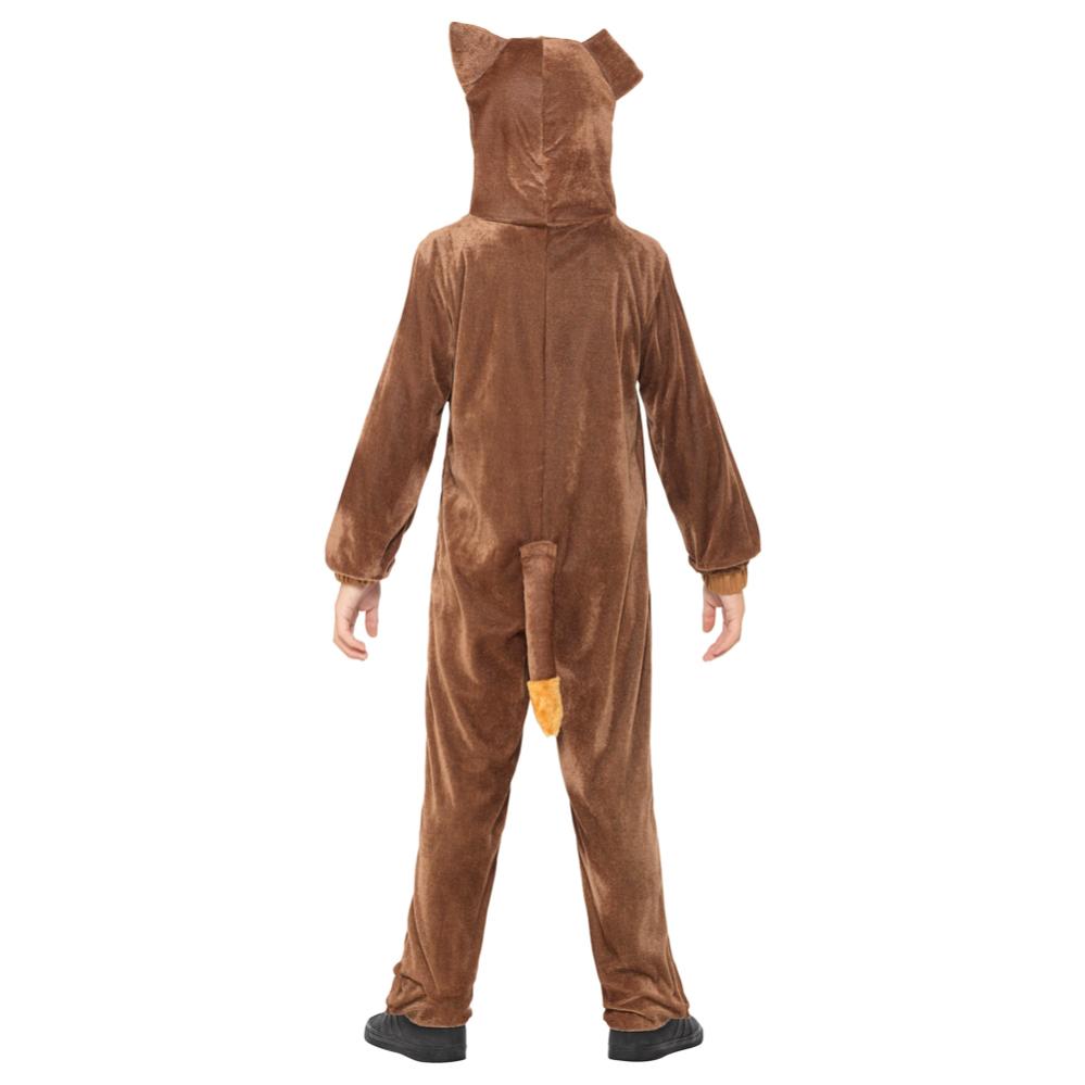 Hund Maskeraddräkt Barn omfattar en hunddräkt för barn med päls, huva och svans. Pälsen är brun och orange på mage, svanstipp och ansikte, huvan har öron, ögon, nos och mun.