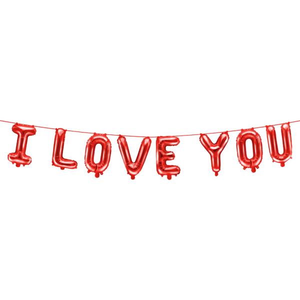 I Love You Bokstavsballonger Röd omfattar 8 st röda bokstavsballonger av folie som bildar texten "I Love You". Ballongerna är ca 40 cm stora och kommer även med ett 3 meter långt ballongsnöre i matchande rött. De har självförslutande ventil och fylls med luft innan de träs på medföljande ballongsnöre.