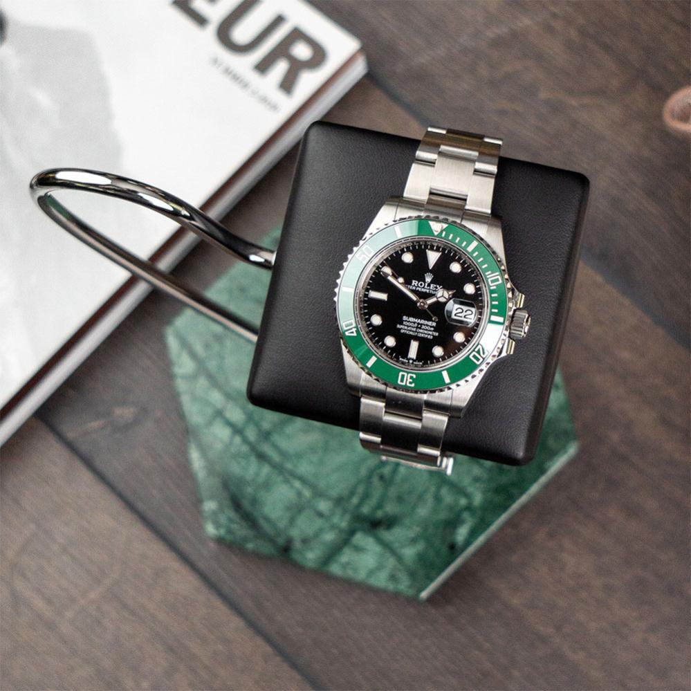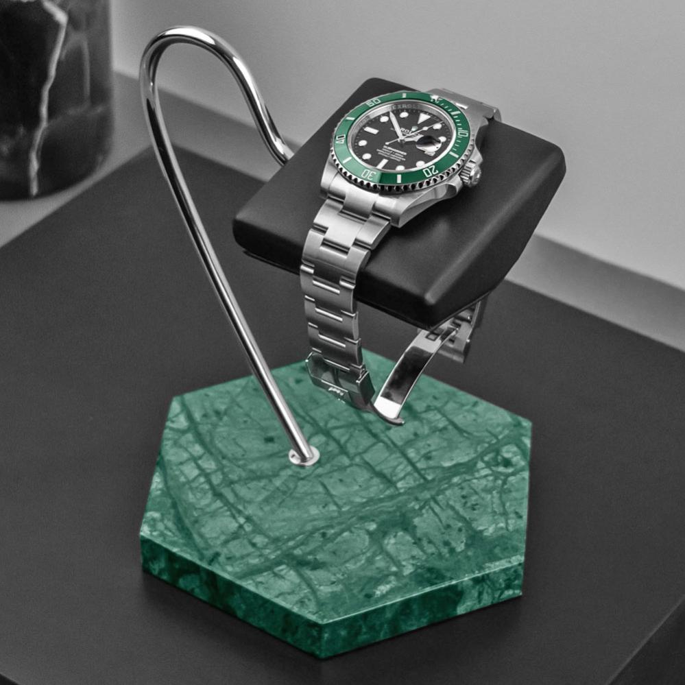 Klockställ av mörkgrön marmor från Watches för dig som vill förvara ditt armbandsur med stil. En vacker klockhållare i en exklusiv kombination av äkta guatemala verde marmor, svart läder och silverfärgat stål. Med det här klockstativet håller sig klockan skyddad från slitage samtidigt som den blir en lyxig inredningsdetalj till hemmet. Helt enkelt en utmärkt hållare för alla klockfantaster som söker ett lyxigt klocktillbehör till sin finaste klocka.
