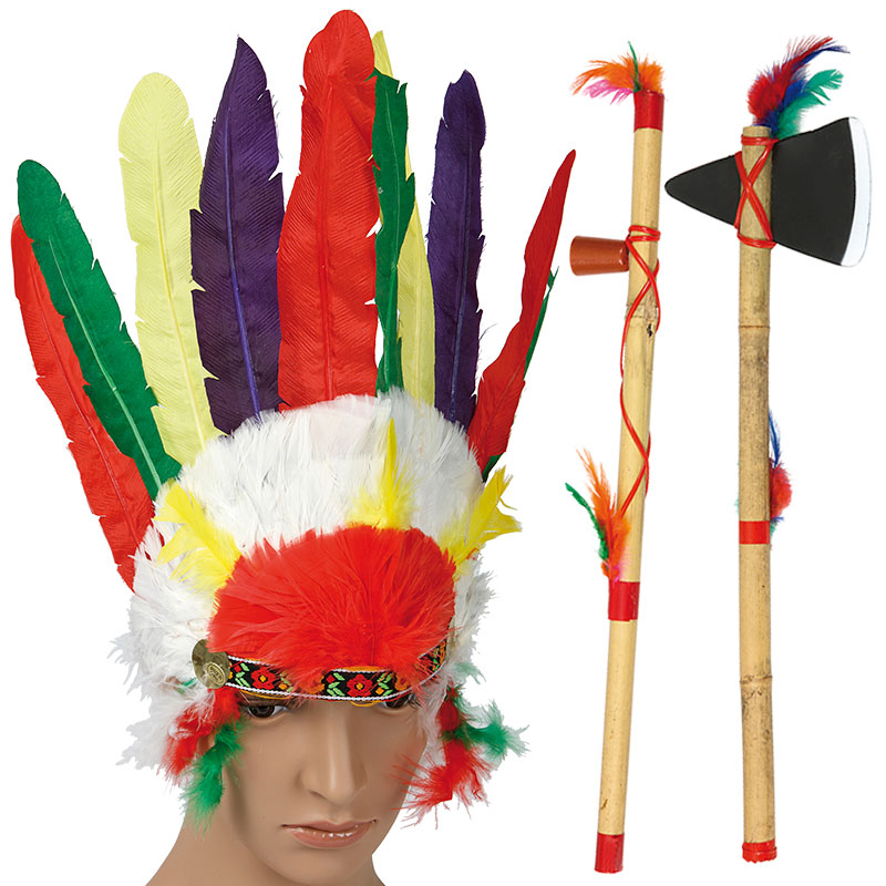 Förvandlas till en indianhövding med dessa indian tillbehör! Gör entré på maskeraden som en cool indianhövding med en pipa i mungipan, häftig indian fjäderskrud på huvudet och en indianyxa i handen. Matcha din fjäder-huvudbonad, yxan och pipan med passande indian kläder för en fulländad indian utstyrsel.