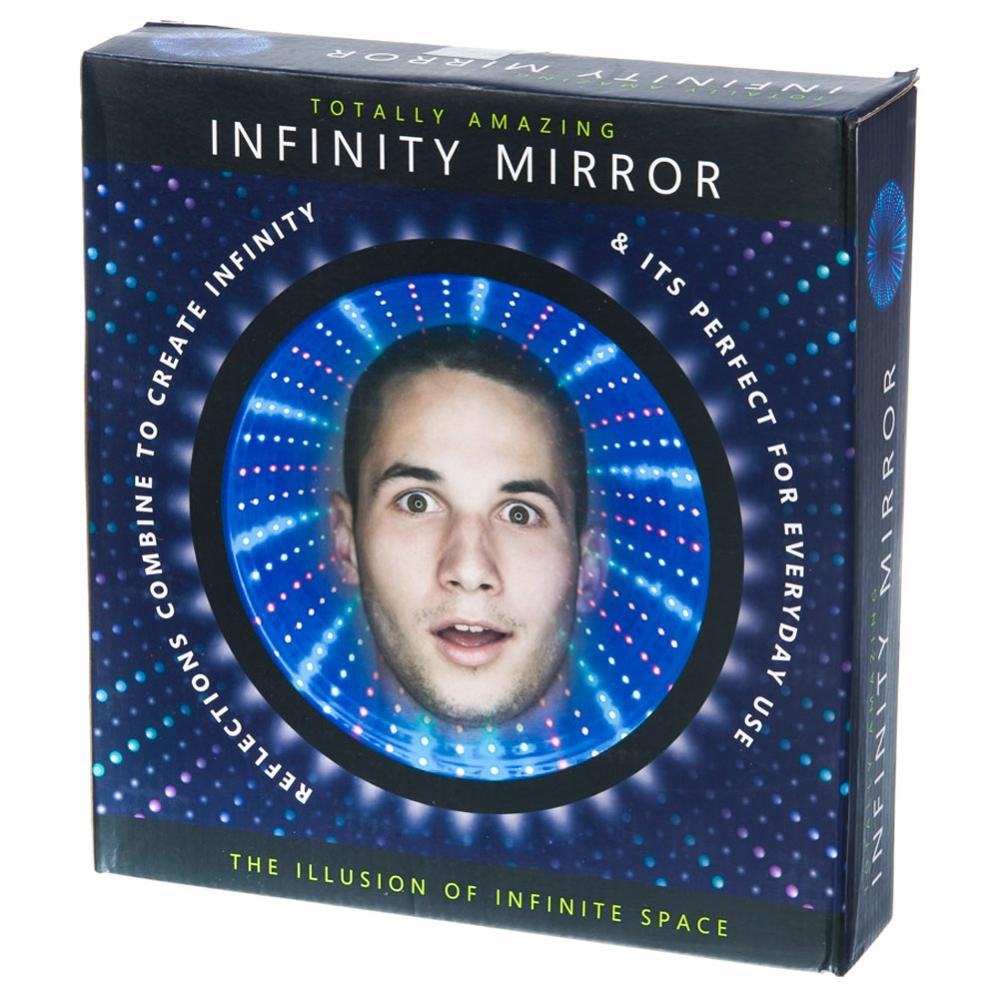 Infinity Spegel omfattar en rund spegel med dekorativ LED-belysning och dubbla speglar som skapar en oändlighets-illusion. Spegeln är ca 23 cm stor och kräver 3 x AA-batterier eller en DC 4.5 6W-adapter.