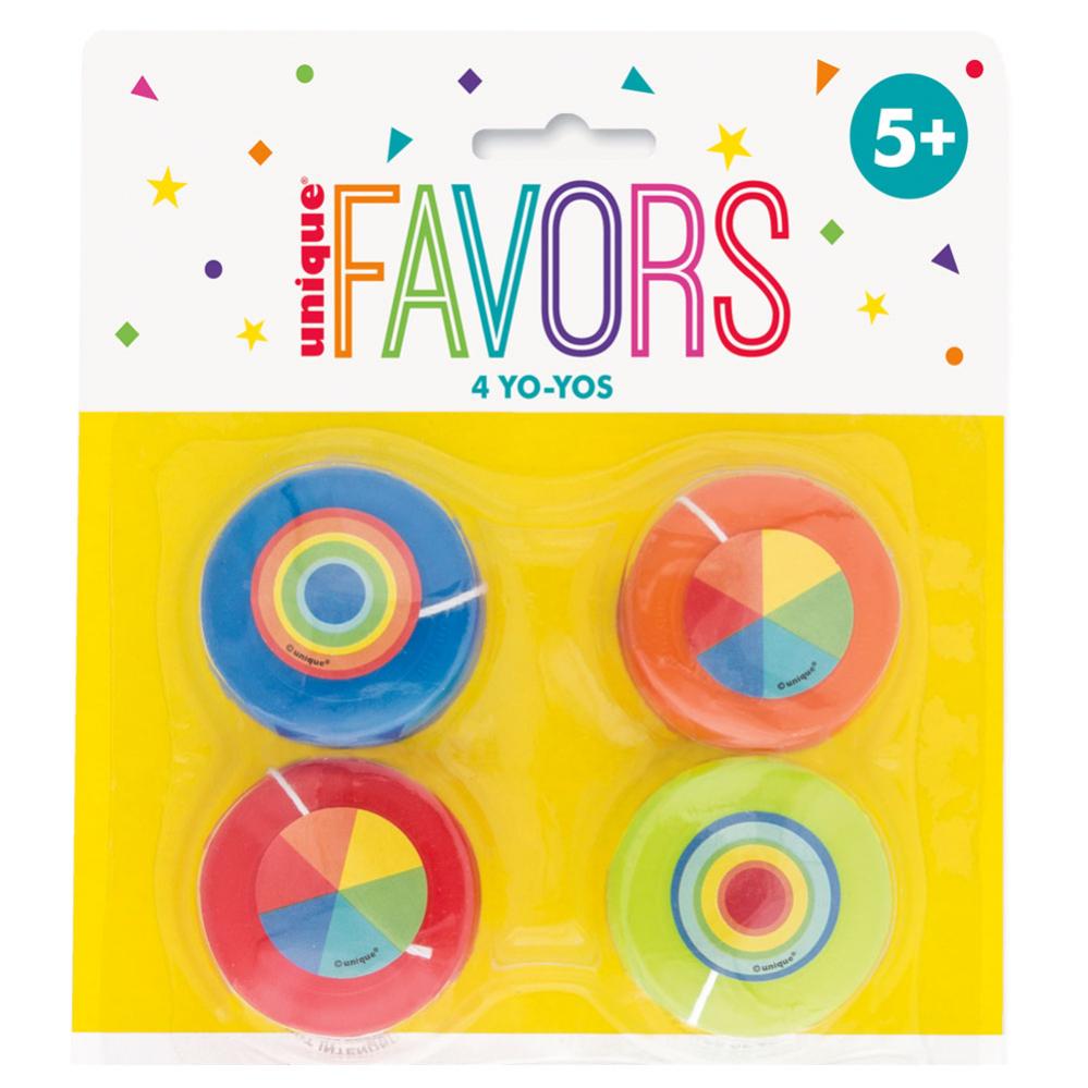 Jojos 4-pack innehåller 4 stycken jojos i färgerna blå, orange, röd och grön med olika mönster. Dessa jojos är tillverkade i plast.