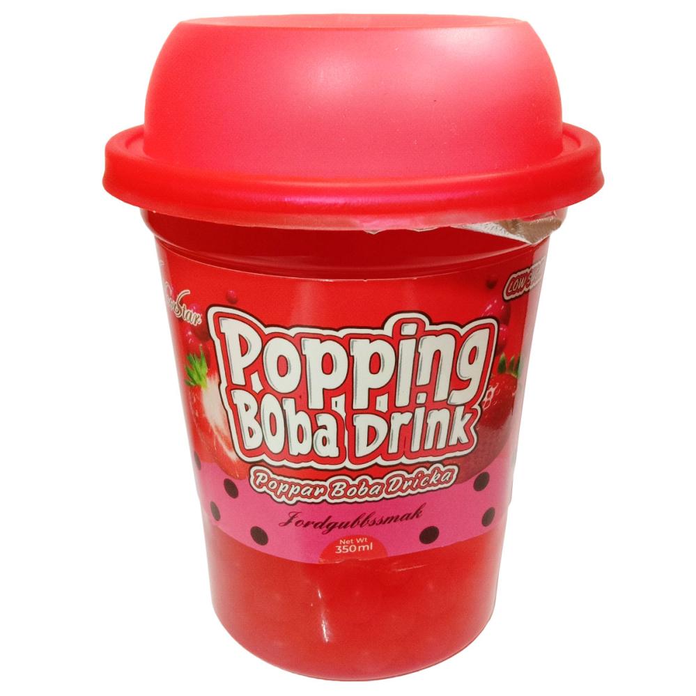 Jordgubbsdryck med Poppar Boba 350 ml är en jordgubbsdryck med poppar boba i en 350 ml plastmugg med ett papperssugrör.