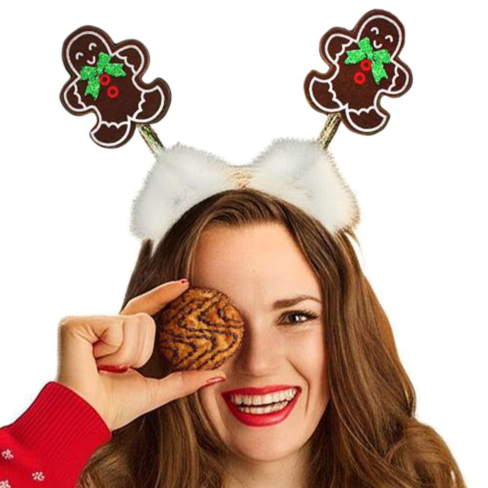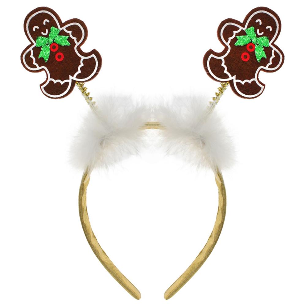 Juldiadem med Pepparkaksgubbar omfattar ett guldfärgat diadem med vitt fluff och utstickande bruna pepparkaksgubbar med julmotiv.