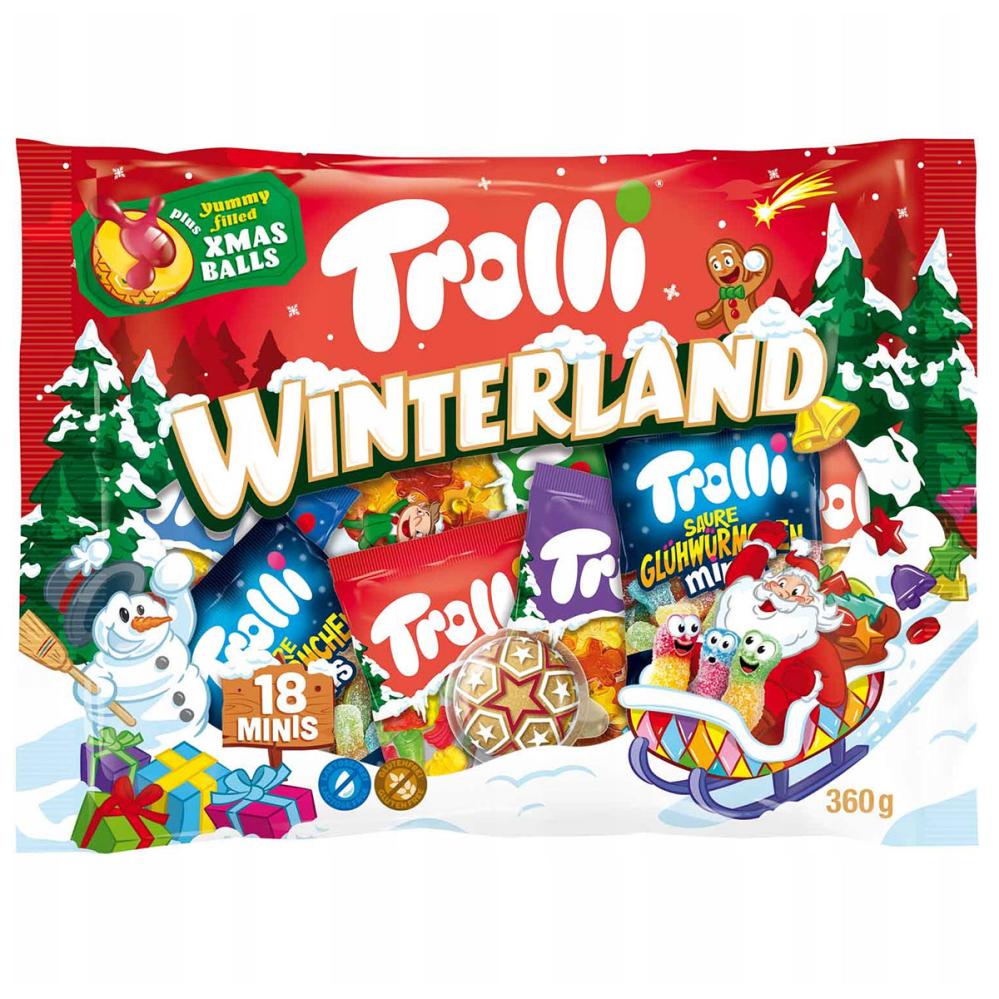 Julgodis Vinterland 360g innehåller sexton påsar med vingummin och två bollar av skumgodis med fruktsmak och julmotiv.