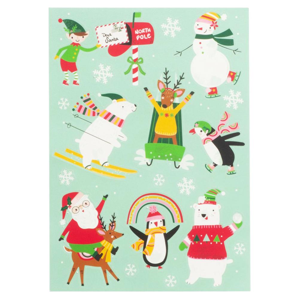 Julklistermärken Figurer omfattar två stycken ark med juliga och färgglada klistermärken i form av snögubbar, pingviner, renar, isbjörnar, tomtar med mera.