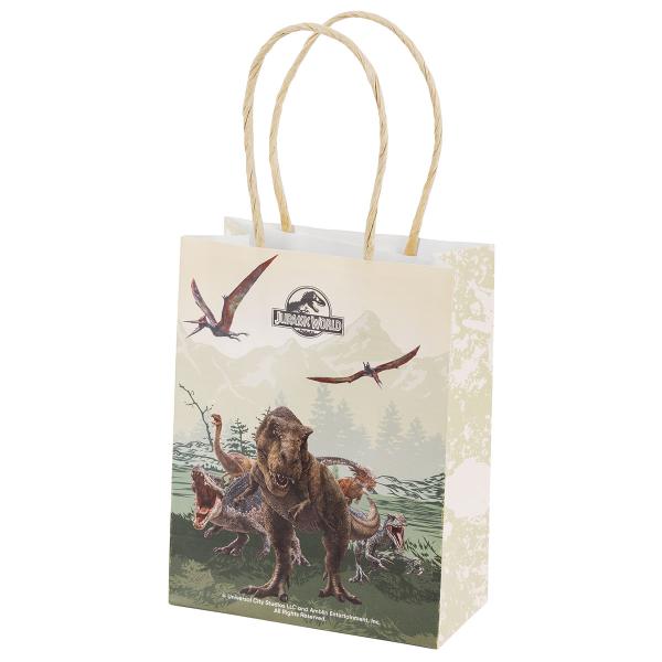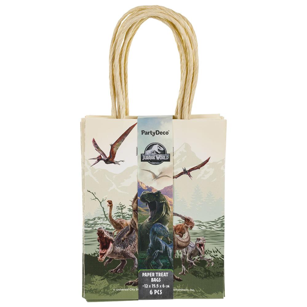 Jurassic World Presentpåsar 6-pack består av sex presentpåsar med motiv av olika dinosaurier, gröna bakgrundstoner och beige handtag.