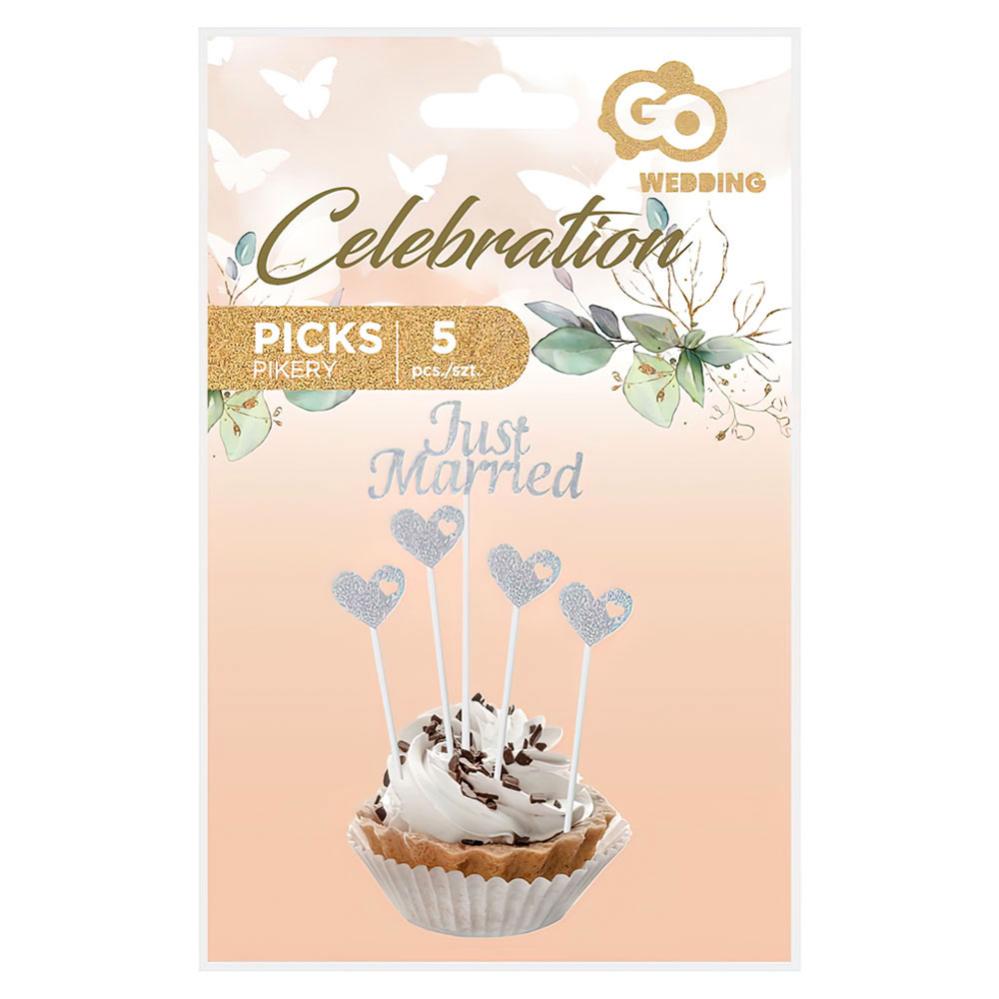Just Married Tårtdekorationer Silver omfattar en tårtdekoration i form av texten "Just Married" och 4 stycken tårtdekorationer i form av hjärtan. Tårtdekorationerna är tillverkade av papp och plast, och är ca 11-17 cm långa.