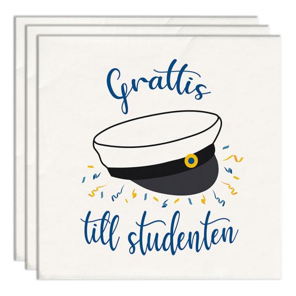 Kaffeservetter Grattis Till Studenten omfattar ett 16-pack vita kaffeservetter med texten "Grattis till studenten" och fint motiv av en studentmössa. Servetterna har tre lager och mäter ca 25 x 25 cm utvikta.