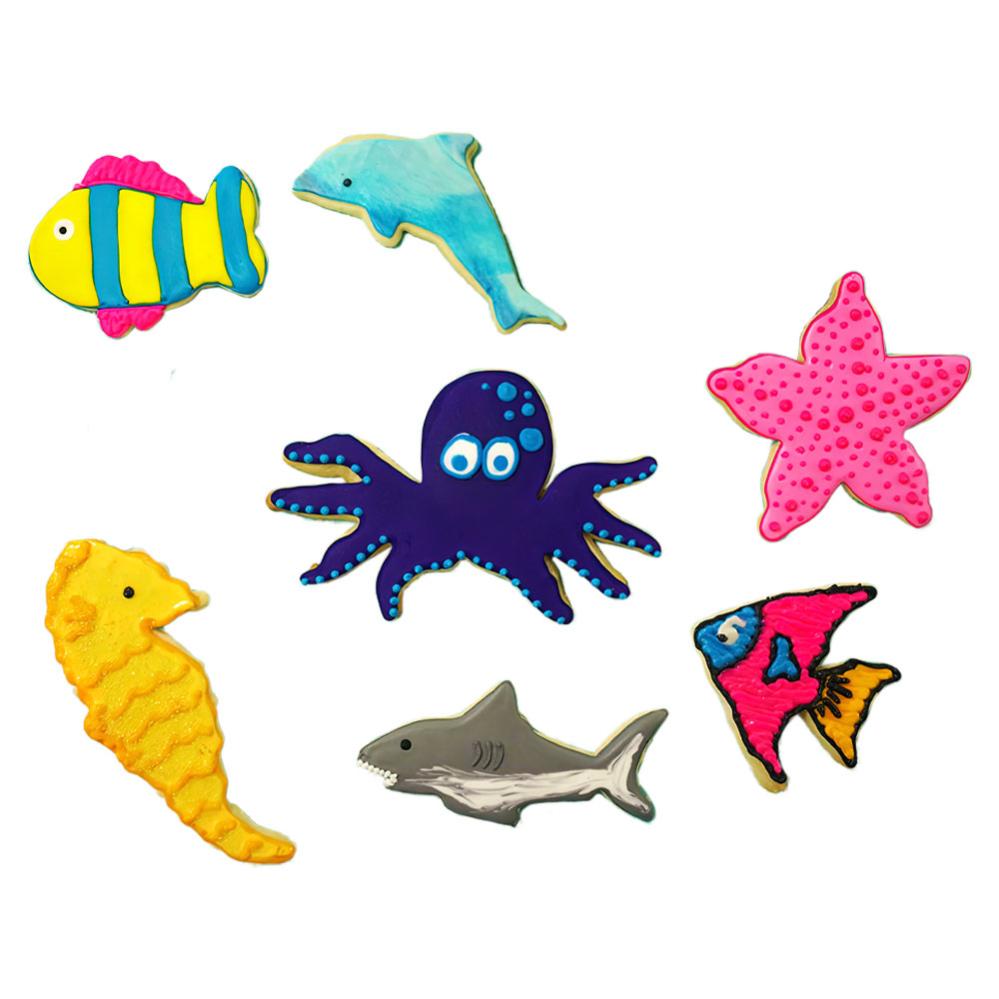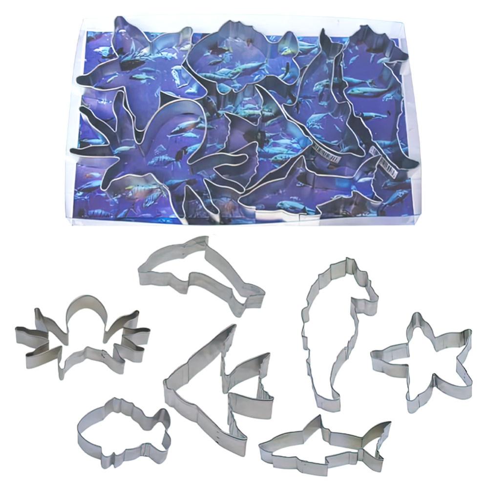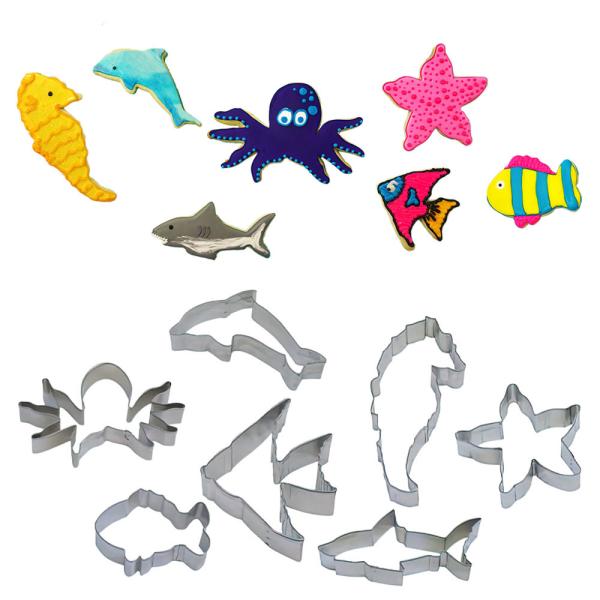 Kakformar Havsdjur omfattar ett set med 7 stycken utstickare i form av en delfin, en sjöhäst, en bläckfisk, en haj, en sjöstjärna och två olika fiskar. Formarna är tillverkade av metall och är ca 9-13 cm stora.