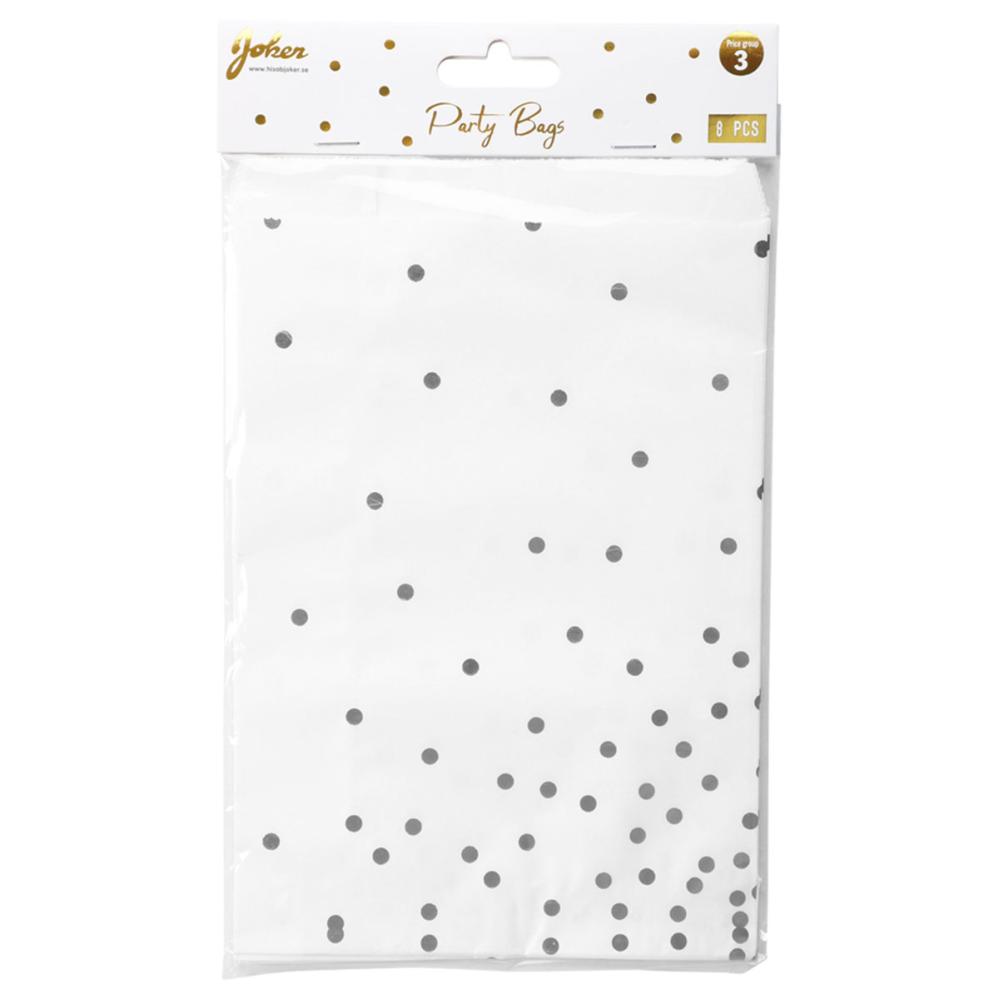 Kalaspåsar med Silverprickar 8-pack består av åtta vita papperspåsar som är dekorerade med små, skimrande silverprickar.
