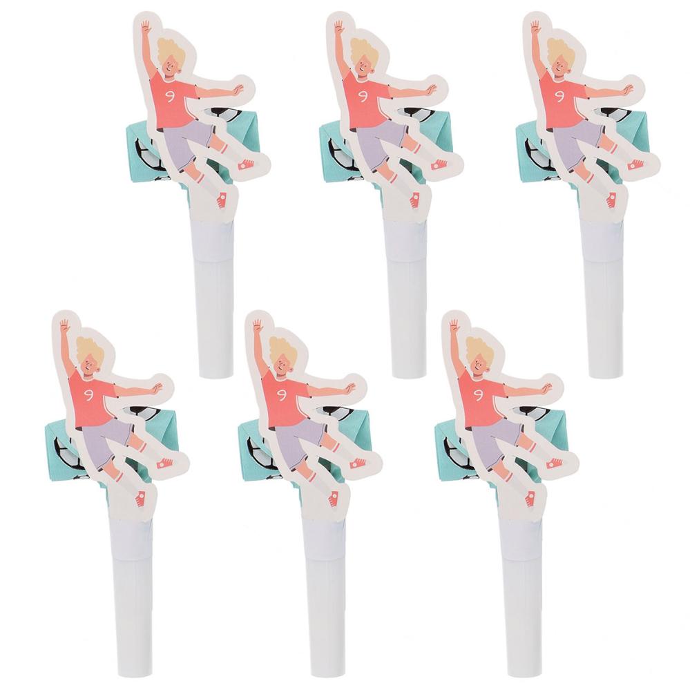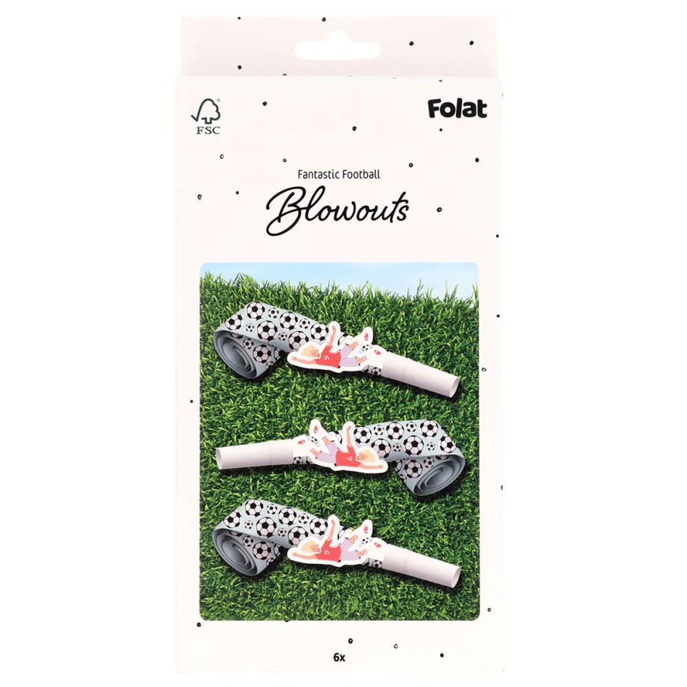 Kalastutor Fotbollskalas 6-pack innehåller sex salviagröna kalastutor som är dekorerade med motiv av fotbollar och försedda med en pappfigur som sitter fast på tutan och har form av en fotbollsspelare. Blås i tutorna för att få dem att tjuta högt och rulla ut sig.