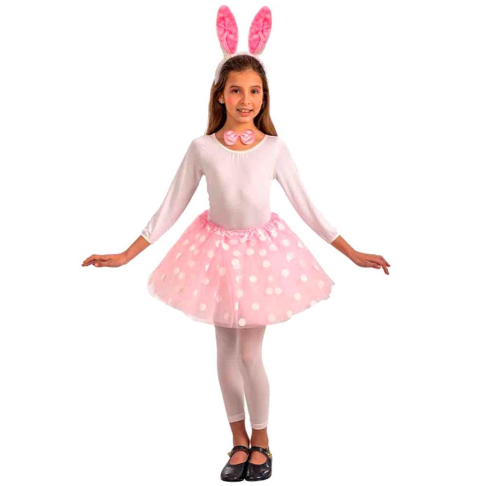 Kanin Maskeraddräkt Rosa/Vit Barn inkluderar en rosa tyllkjol med vita prickar, en rosa fluga samt ett vitt diadem med utstickande kaninöron i vitt och rosa.
