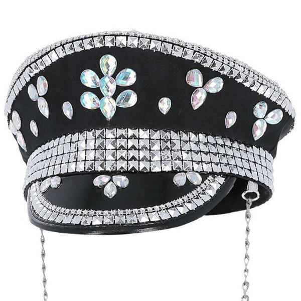 Kaptenshatt med Paljetter & Nitar omfattar en svart kaptenshatt med silverfärgade nitar, holografiska strass och en lång silverfärgad kedja.