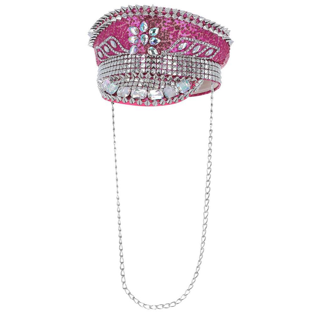 Kaptenshatt Paljetter och Nitar Rosa omfattar en kapten hatt med rosa paljetter och nitar i silverfärgad plast, regnbågsskimrande strass i plast samt en lång kedja.