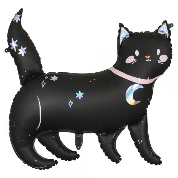 Katt Folieballong Stor omfattar en stor ballong i folie form av en svart katt med rosa halsband och holografisk halvmåne och stjärnor. Ballongen har öglor vid öra, svans och under magen där du kan trä i snöre. Ballongen är ca 81 x 80 cm stor, fylls med luft eller helium och har självförslutande ventil.