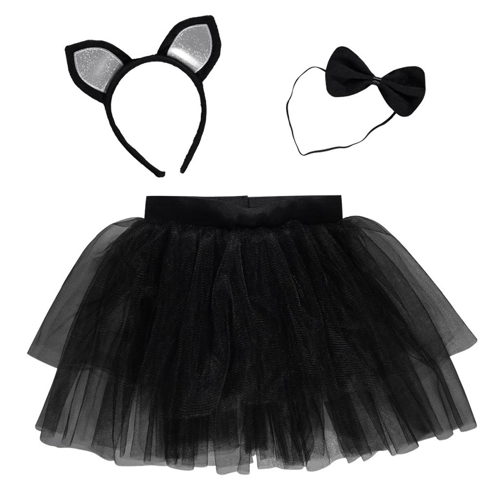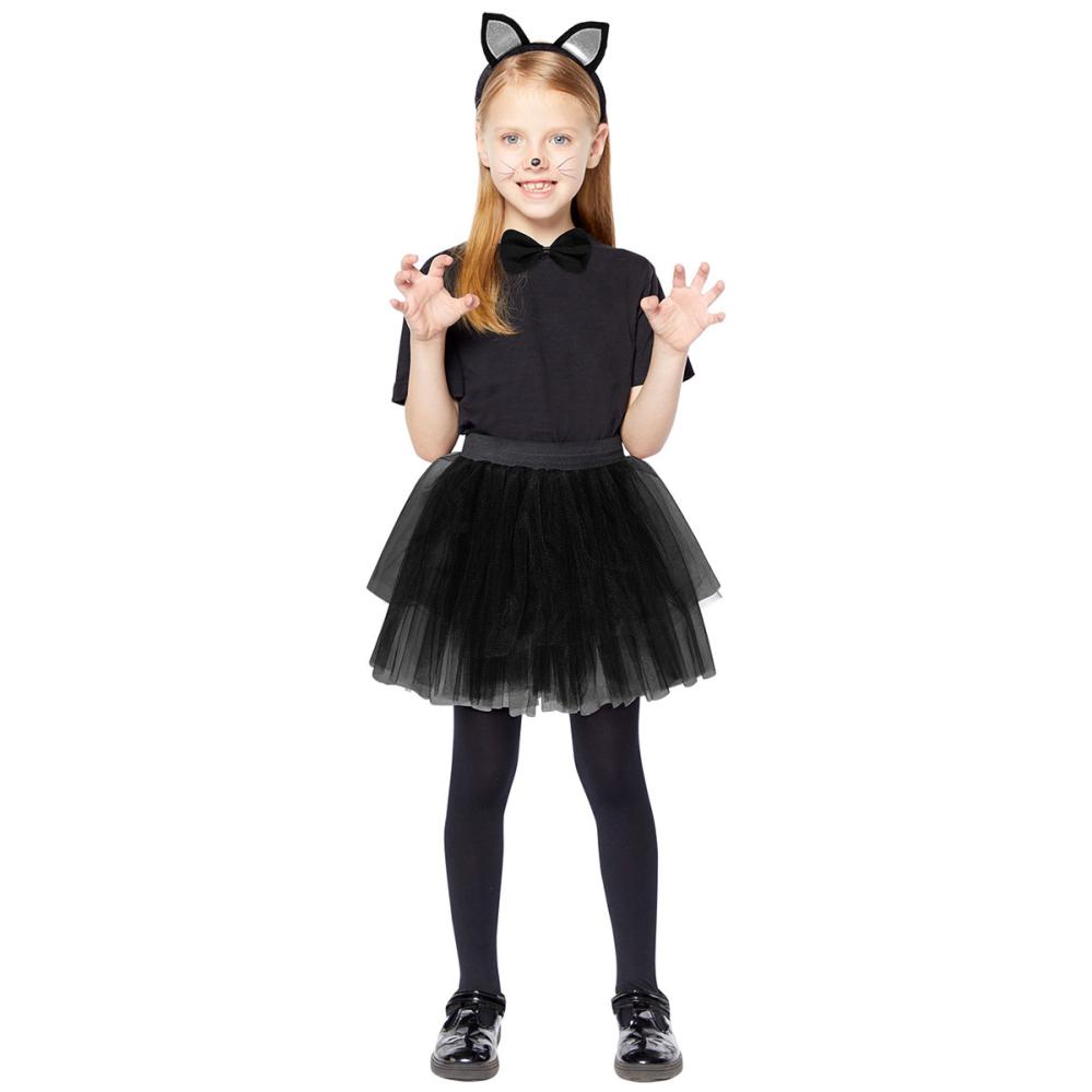Katt Tillbehörskit Barn består av tre delar med kattmotiv för barn mellan 3-8 år. Setet innehåller ett svart diadem klätt i tyg med skimrande silvriga öron, en svart fluga på ett elastiskt halsband och en svart tyllkjol.