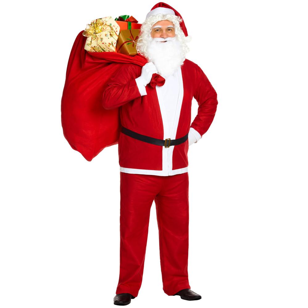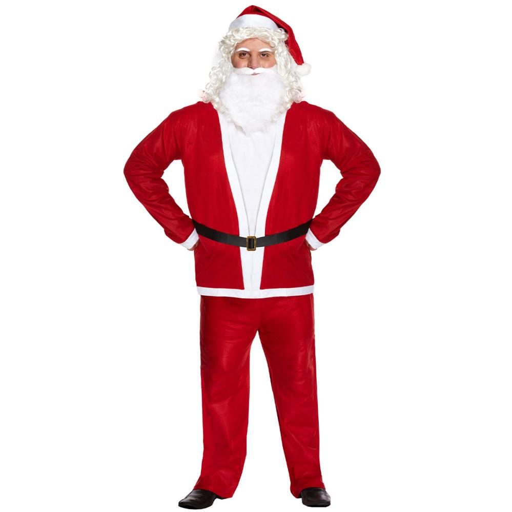 Klassisk Jultomtedräkt omfattar en sammetsliknande tomtedräkt i rött och vitt som innehåller en jacka, ett par byxor, ett svart bälte med ett guldigt spänne, en tomteluva och ett tomteskägg med tillhörande mustasch.