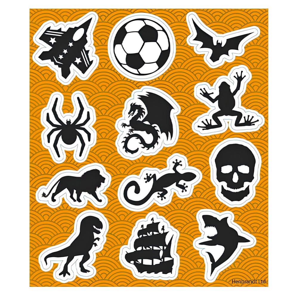 Klistermärken Olika Motiv omfattar ett ark med 12 st svarta stickers med motiv av en fotboll, ett piratskepp, ett rymdskepp, en döskalle och olika djur. Klistermärkena är tillverkade av papp och är ca 2,5-3,5 cm stora.